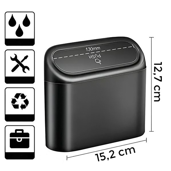 Ta kompaktni koš za smeti poskrbi za čistočo in urejenost vašega vozila, ne da bi zavzel preveč prostora. Njegova zasnova ponuja dovolj prostora za vsakodnevne odpadke, zato je praktičen in diskreten.