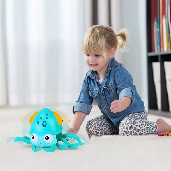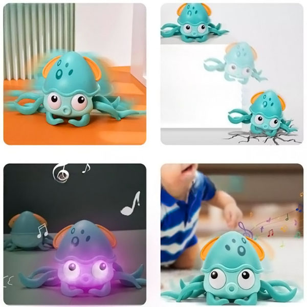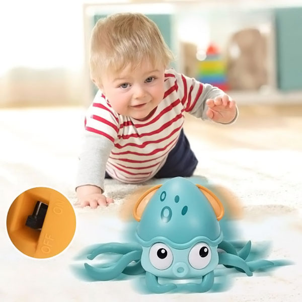 Ta igriva hobotnica se plazi naokoli, kar navdihuje dojenčke, da ji sledijo in razvijajo svoje motorične spretnosti.
