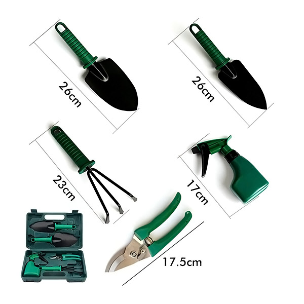 1 x Set vrtnega orodja s škatlo za shranjevanje: 1 x klešče/grablje za plevel, 2 x žlice za sajenje, 1 x škarje za obrezovanje, 1 x razpršilnik.